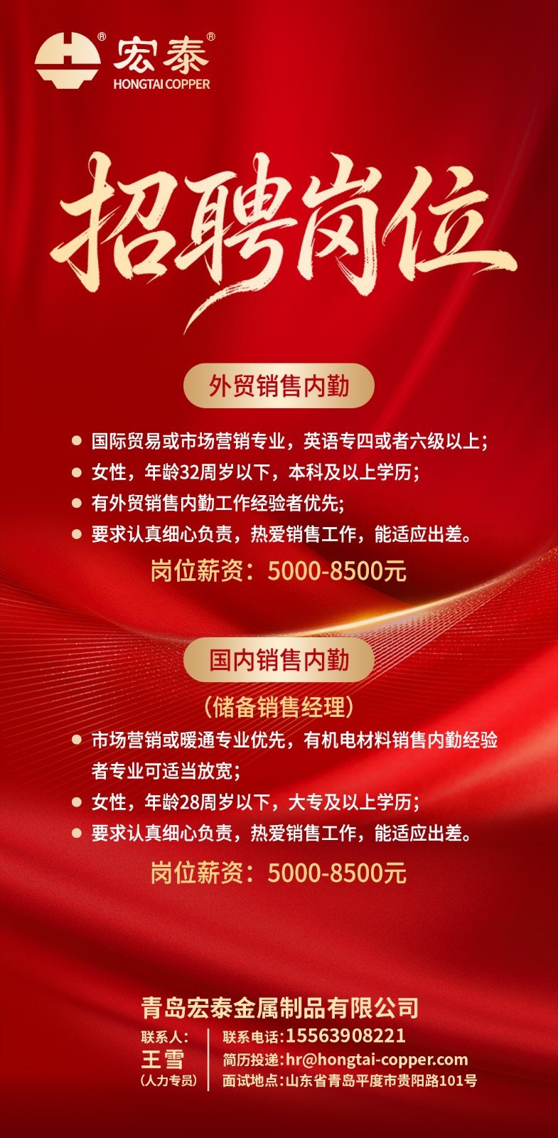 宏泰自1993年開(kāi)始一直專(zhuān)注于紫銅管系列產(chǎn)品的研發(fā)與生產(chǎn),宏泰商標(biāo)也榮獲“中國(guó)馳名商標(biāo)”的殊榮,企業(yè)年銷(xiāo)售達(dá)三十多億元,展現(xiàn)出強(qiáng)勁的發(fā)展實(shí)力。作為平度本土企業(yè),宏泰在三十多年的發(fā)展歷程中,積淀了深厚的企業(yè)文化底蘊(yùn)。公司新建“智能化綠色制造高精度紫銅管生產(chǎn)線”,為滿足發(fā)展需求,補(bǔ)充優(yōu)秀賢能人士,需要招聘以下崗位。
