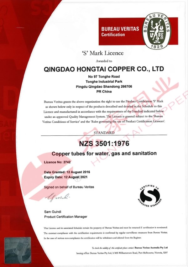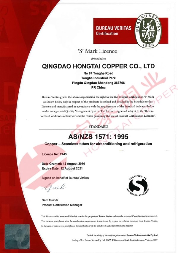 近日宏泰接到國際知名認證機構必維國際檢驗集團(Bureau Veritas)通知,宏泰銅管產品再次通過NZS 3501水汽衛生用銅管標準認證【證書編號:2742】、AS/NZS 1571無縫制冷用銅管標準認證【證書編號:2743】和AS 1432 給排水銅管標準認證【證書編號:23264】。此三項認證是宏泰在2004年首次通過上述認證后與標準體系的同步更新認證。
