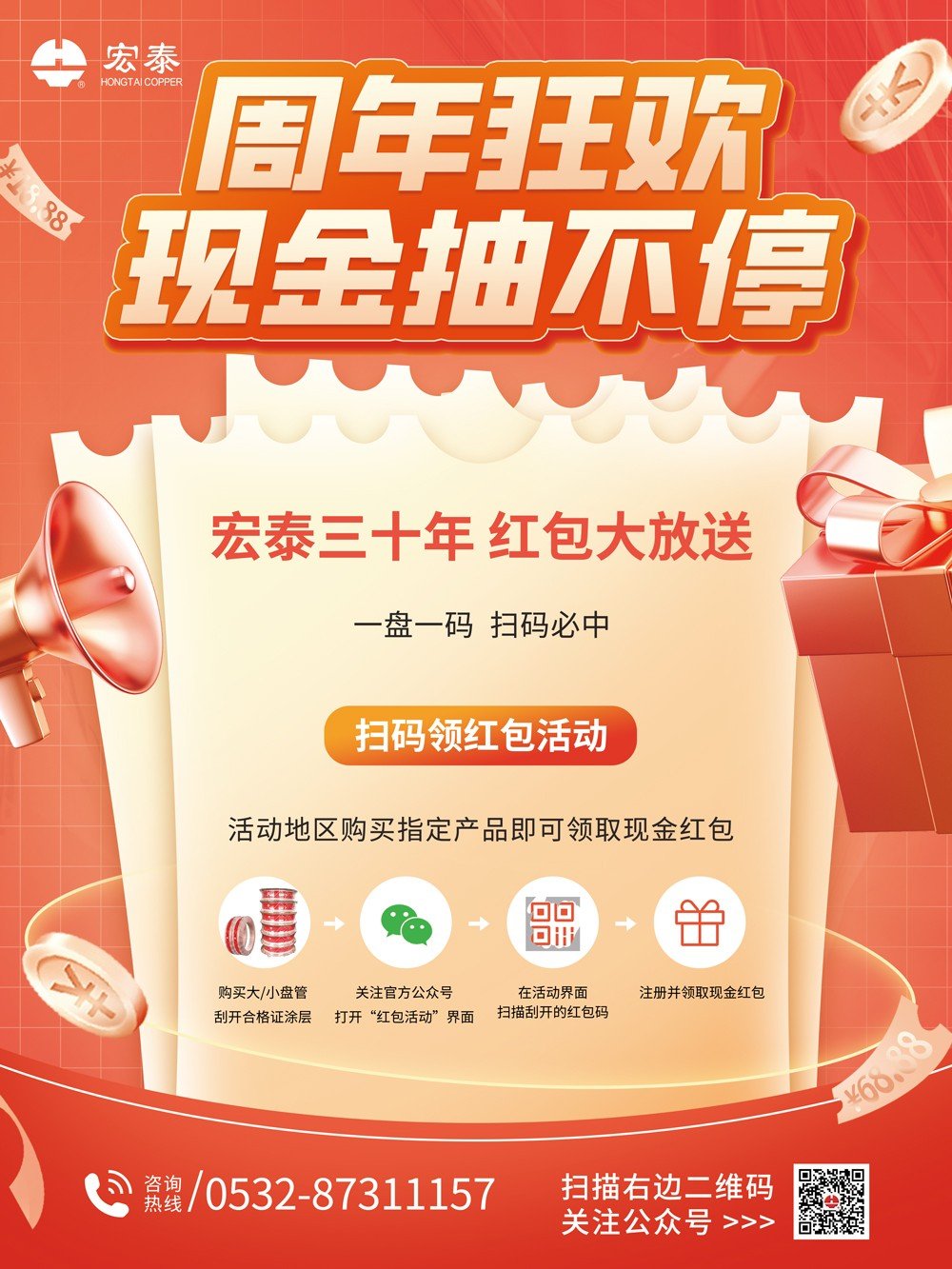 2023年,宏泰30歲。在這具有重大意義的時刻,公司經(jīng)過前期的技術(shù)研發(fā),決定在宏泰30年來臨之際,推出感恩客戶的又一具體活動——掃碼領(lǐng)紅包。凡是宏泰銅管的終端用戶,購買宏泰銅管后,通過手機掃碼,均可領(lǐng)取金額不等的紅包。公司通過這一活動,力促進一步粘合與客戶緊密度,真正做到回饋終端客戶。通過掃碼領(lǐng)紅包活動,讓客戶真切感受到公司在回饋客戶方面的熱情。為了真正做到回饋終端客戶,參與該活動的,僅限宏泰銅管的終端客戶,經(jīng)銷商不參與該活動。讓利終端客戶(非中間商),這在宏泰歷史上是首次,是一次全新的嘗試,公司后期會推出更多的感恩客戶的具體活動,敬請期待。